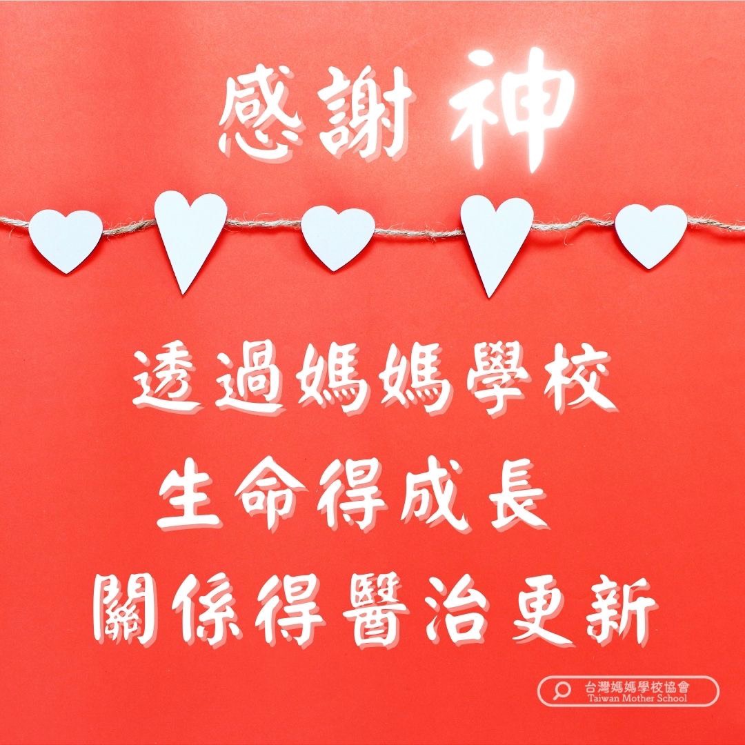 上了課程後我更是對先生順服尊重,對孩子更溫柔,知道怎麼教導她。很重要的是,我更明白神非常愛我、看重我。雖然我先生很讓我無言…,但神也教導我,要將眼光擺在跟他的關係,而且很常被神這樣提醒!但總是無法做到啊!我必須這樣說神透過媽媽學校的課程讓我可以做到了,把眼光與神的關係建立好,而且是逐漸的進步中,感謝神!